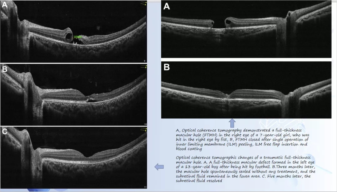 崔丽颖医生从小儿黄斑裂孔的病因、特征及处理等几方面入手,认为外伤是儿童黄斑裂孔最普遍的原因,也是造成儿童最终视力低下的危险因素,由创伤引起的黄斑小孔容易自发闭合,但发病时间长,大的裂孔预后往往不佳,所以较短的手术干预时间能进一步改善儿童视力。